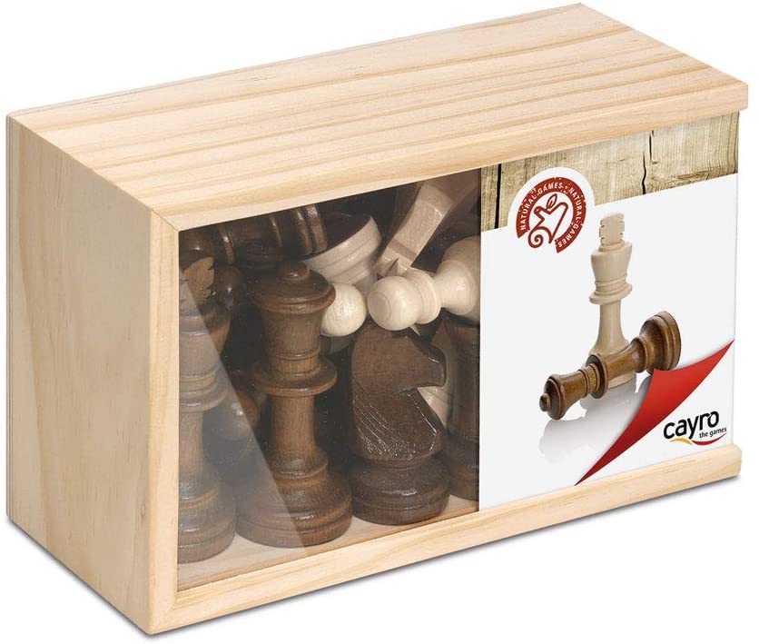 Juego de figuras de ajedrez de madera con caja del mismo material y tapa transparente.